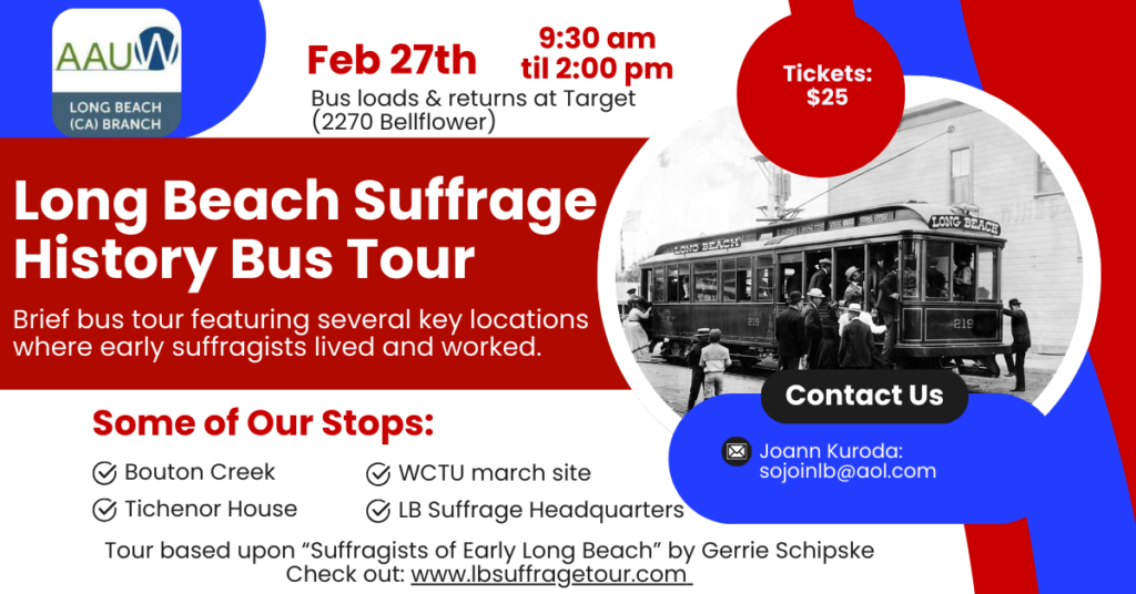 We traveled the City of Long Beach guided by our tour leader Gerrie Schipske. She described the history of the early suffragettes and how they paved the way so the women in our city would be the forerunners of all that we have accomplished. Lunch followed at the 2nd and PCH Shopping Center.